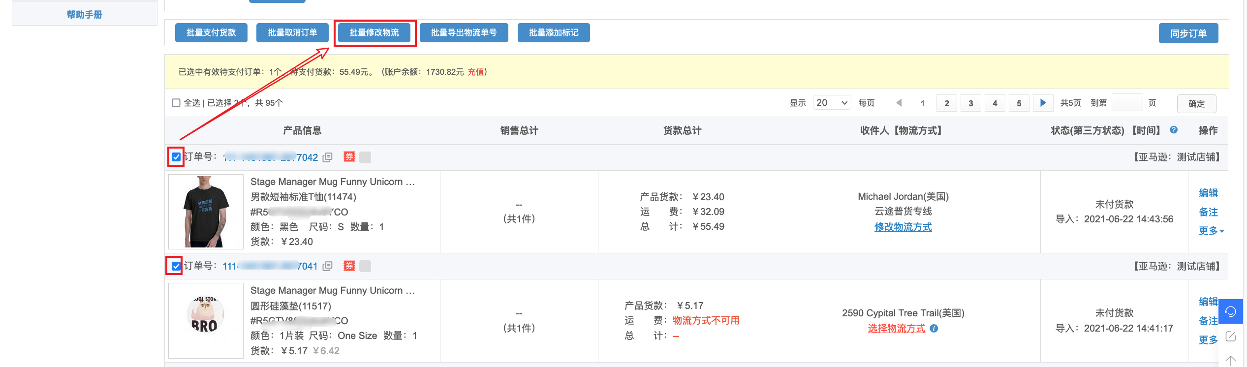 2)批量修改:勾选需要修改物流的订单,点击【批量修改物流】按钮(只有未付货款的订单支持批量修改)