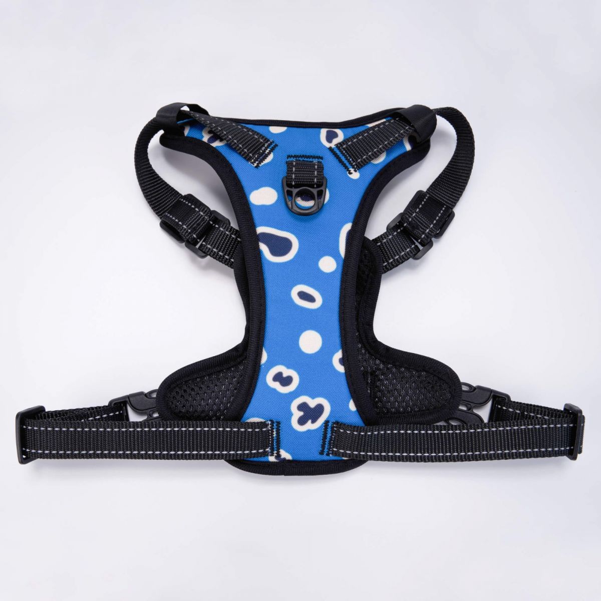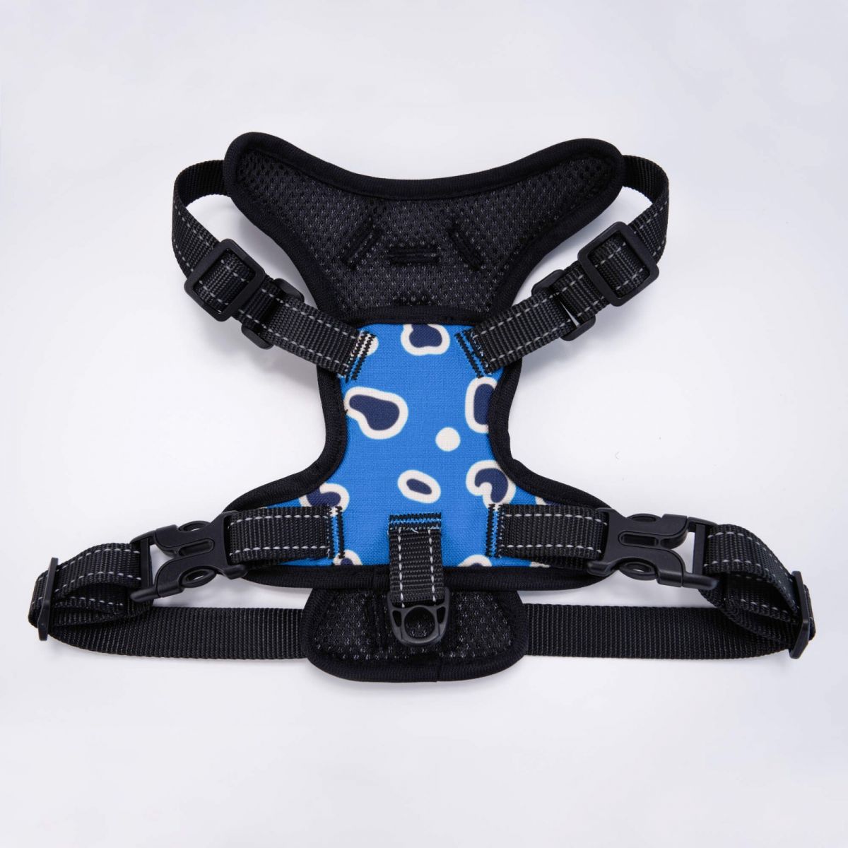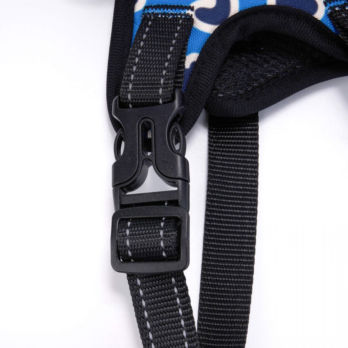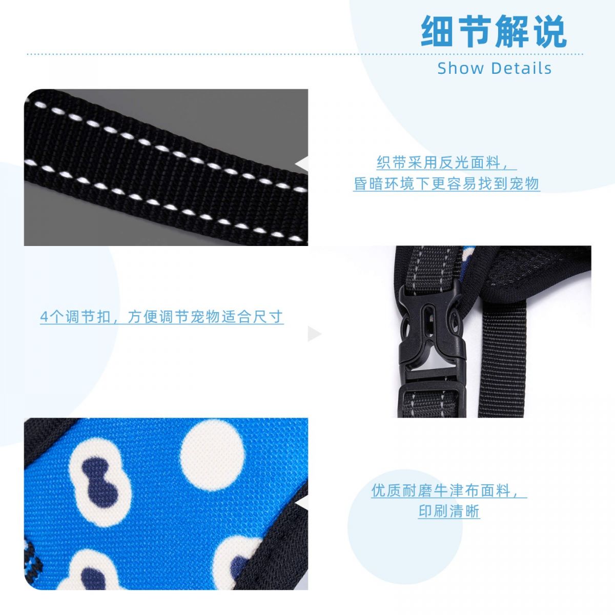 【配件构造】背心设计,左右边有2个快速插扣,4个调节扣和插扣方便宠物穿着,背心上方和底部共有2个可以挂牵引绳的扣具。(含配件配宠物牵引绳。)